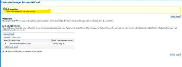 Your preferences is now updated. This user (SYSMAN in this case) will now need to subscribe to rules for which he want to receive notifications.