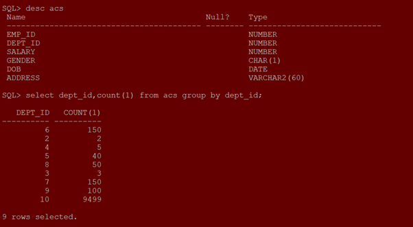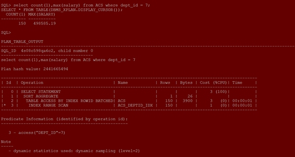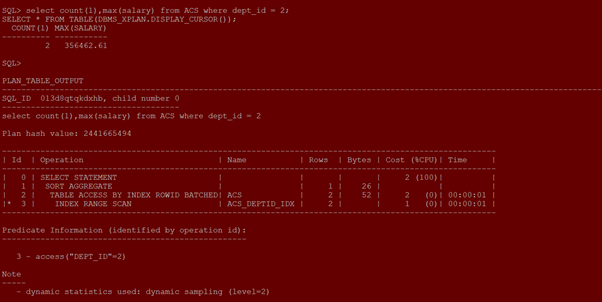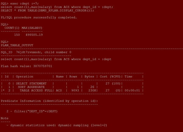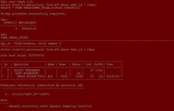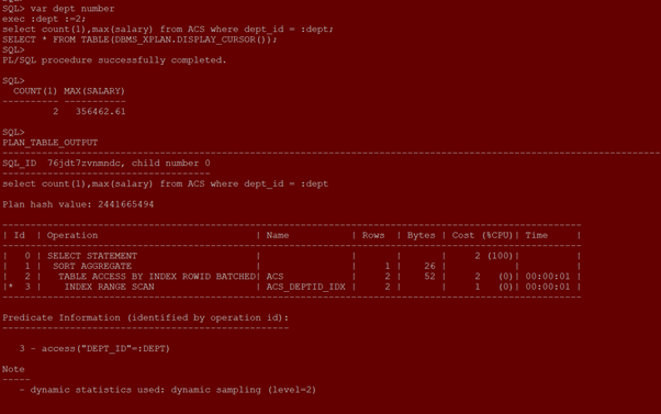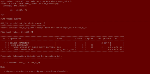 select count(1),max(salary) from ACS where dept_id = :dept;