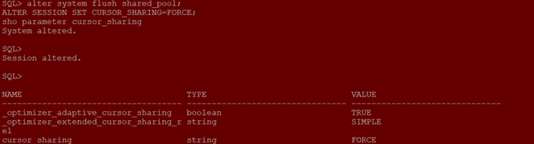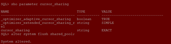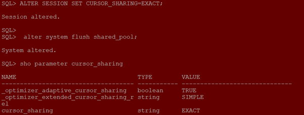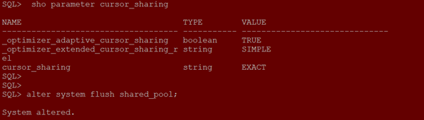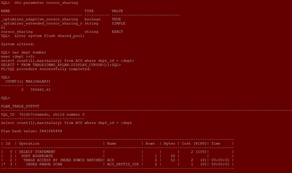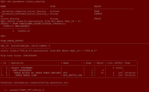 Here we are taking example of cursor_sharing=EXACT and bind variable combination. Results will be same in cursor_sharing=FORCE
