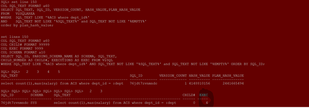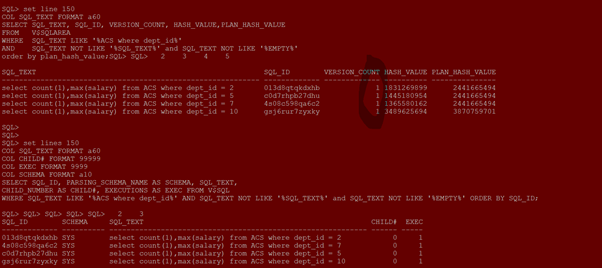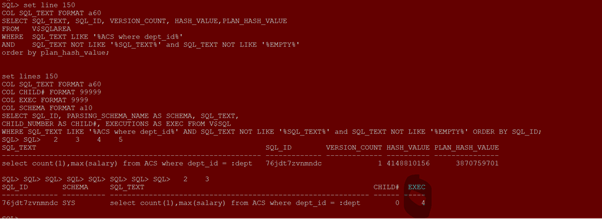 WHERE SQL_TEXT LIKE ‘%ACS where dept_id%’ AND SQL_TEXT NOT LIKE ‘%SQL_TEXT%’ and SQL_TEXT NOT LIKE ‘%EMPTY%’ ORDER BY SQL_ID;