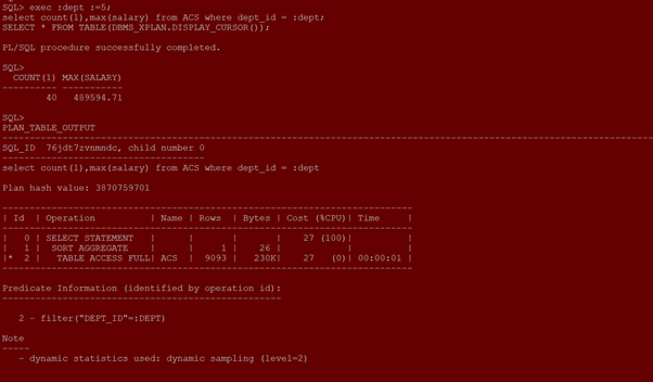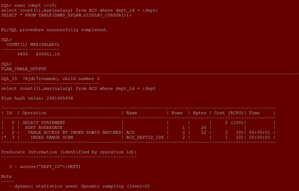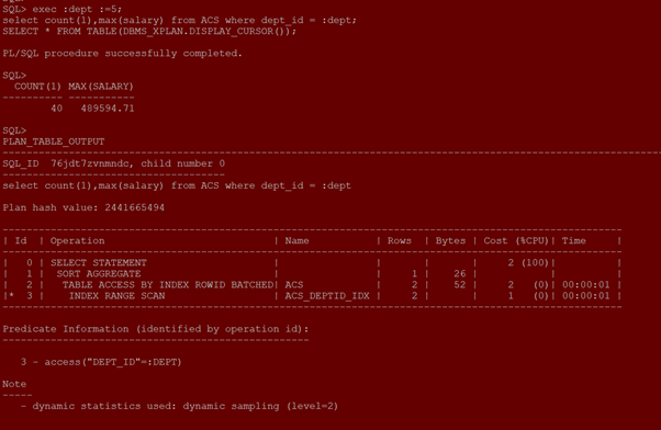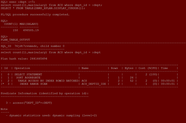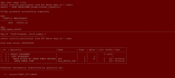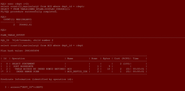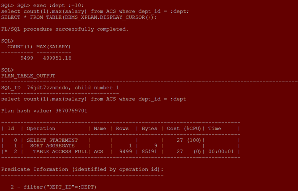 we will run these statements – As seen above dept_id=10 should have a FULL TABLE SCAN but here all plans are same. Because first value passed in bind was 2 and it used index range scan. This will be used for bind peeking and optimizer will assume that all other values will also have same plan. IF THAT FIRST VALUE would have been 10 then all plans will have full table scan.