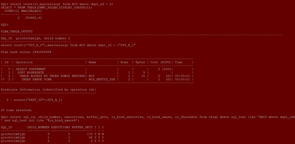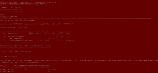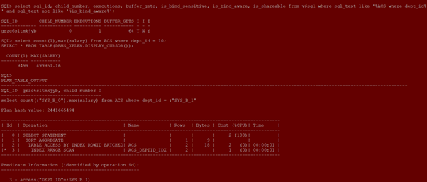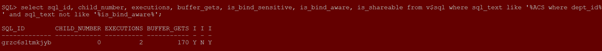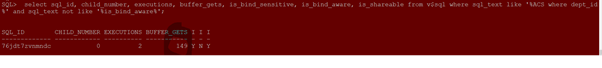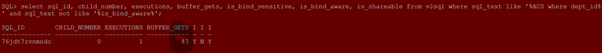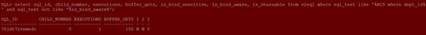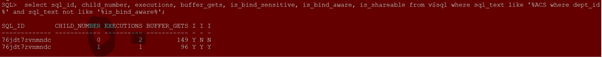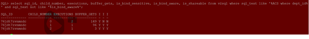 select sql_id, child_number, executions, buffer_gets, is_bind_sensitive, is_bind_aware, is_shareable from v$sql where sql_text like ‘%ACS where dept_id%’ and sql_text not like ‘%is_bind_aware%’;