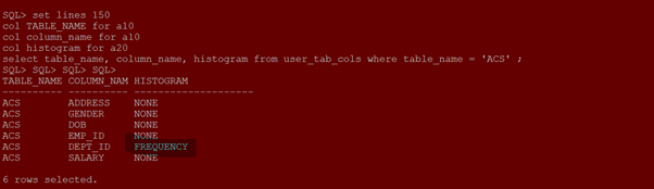 select table_name, column_name, histogram from user_tab_cols where table_name = ‘ACS’ ;