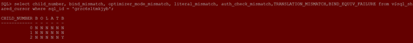 select child_number, bind_mismatch, optimizer_mode_mismatch, literal_mismatch, auth_check_mismatch,TRANSLATION_MISMATCH,BIND_EQUIV_FAILURE from v$sql_shared_cursor where sql_id = ‘grzc6s1tmkjyb’;