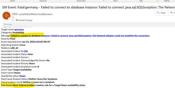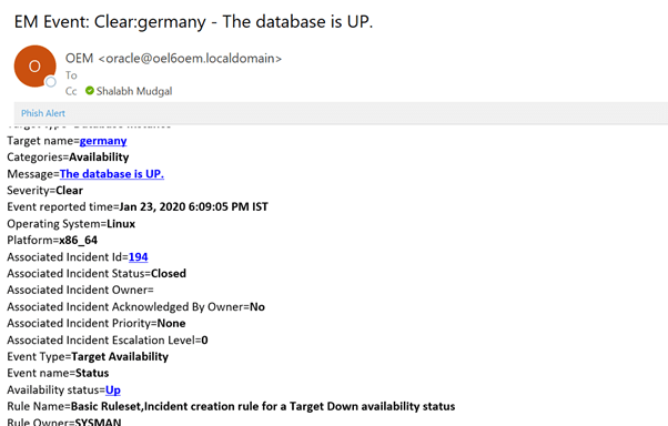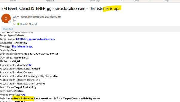 Now let see the email notification. I have started database and listener on a monitored target.