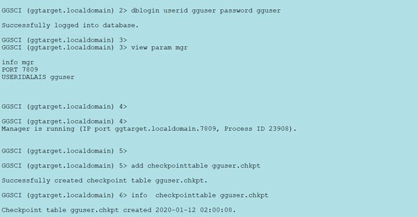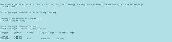 add replicat rep1 exttrail /u01/app/oracle/product/gghome/dirdat/ab checkpointtable gguser.chkpt