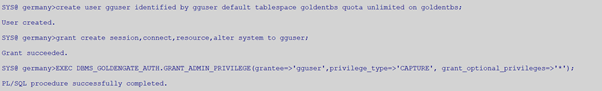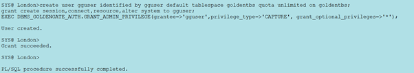 DBMS_GOLDENGATE_AUTH.GRANT_ADMIN_PRIVILEGE(grantee=>'gguser',privilege_type=>'CAPTURE', grant_optional_privileges=>'*');