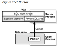 As shown in the following graphic, you can think of a cursor as a pointer on the client side and as a state on the server side. Because cursors are closely associated with private SQL areas, the terms are sometimes used interchangeably.