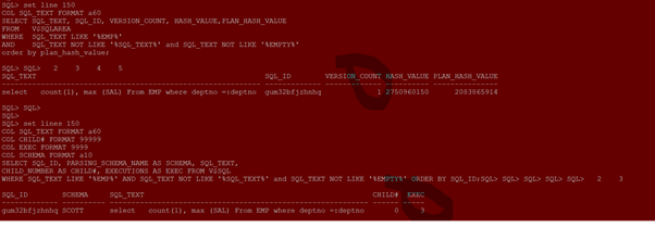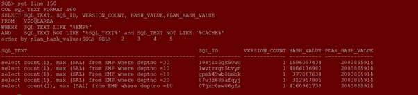 WHERE SQL_TEXT LIKE ‘%EMP%’ AND SQL_TEXT NOT LIKE ‘%SQL_TEXT%’ and SQL_TEXT NOT LIKE ‘%CACHE%’ ORDER BY SQL_ID;
