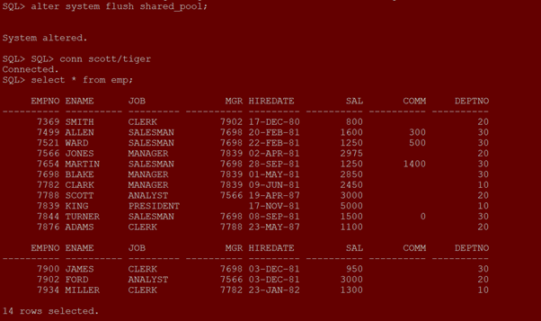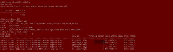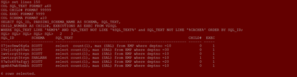 WHERE SQL_TEXT LIKE ‘%Shalabh.t1%’ AND SQL_TEXT NOT LIKE ‘%SQL_TEXT%’ and SQL_TEXT NOT LIKE ‘%CACHE%’ ORDER BY SQL_ID;