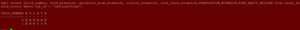 select child_number, bind_mismatch, optimizer_mode_mismatch, literal_mismatch, auth_check_mismatch,TRANSLATION_MISMATCH,BIND_EQUIV_FAILURE from v$sql_shared_cursor where sql_id = ‘1wvtzrgt5tvyn’;