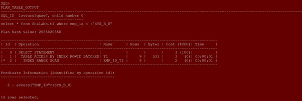 Explain plan shows that shows that all three statements used the same plan. The optimizer chose the plan, an index range scan, because it peeked at the first value (10) bound to the system bind variable, and picked this plan as the best for all values. In fact, this plan is not the best plan for all values. When the value is 9000, a full table scan is more efficient.