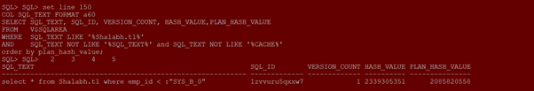 SELECT SQL_TEXT, SQL_ID, VERSION_COUNT, HASH_VALUE,PLAN_HASH_VALUE