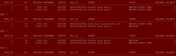 select inst_id,sid,USERNAME ,STATUS,SQL_ID,EVENT from gv$session where sid in (43,77,63,76,80) order by sid;