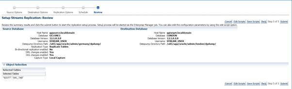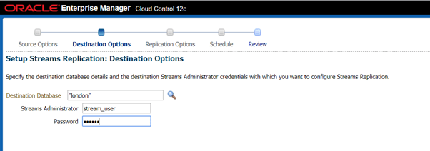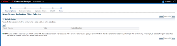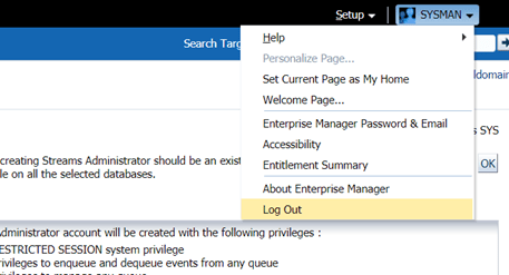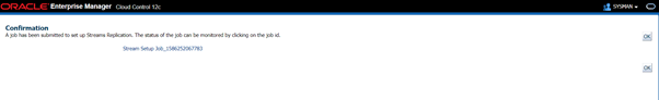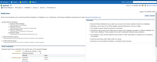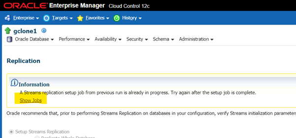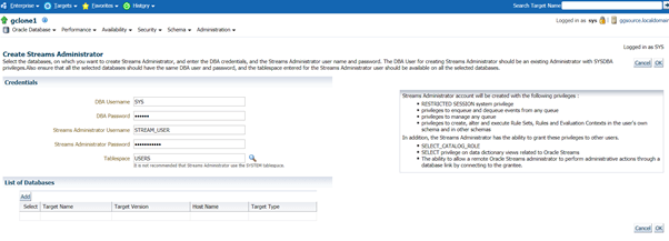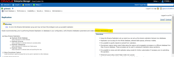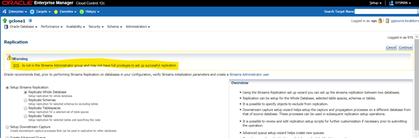 You will receive a warning message that SYS – Is not in the Streams Administrator group and may not have full privileges to set up successful replication. So you need to ensure that a streams user is created before you proceed further.