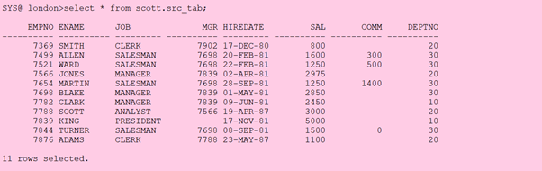 SYS@ london>select owner,object_name,object_type,to_char(created,'dd-mm-yy hh24:mi:ss') from dba_objects where object_name='SRC_TAB';
