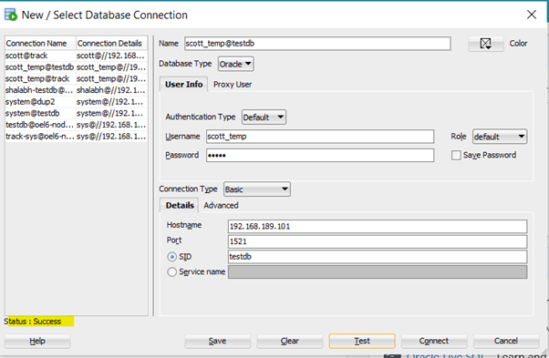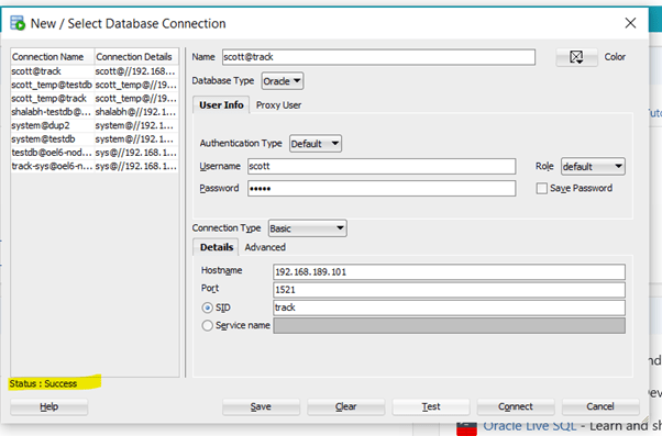 Now create connections for scott@track and scott_temp@testdb in sql developer.