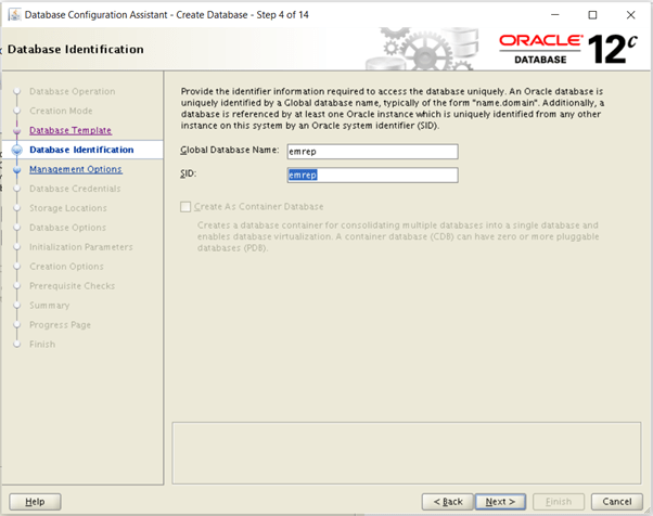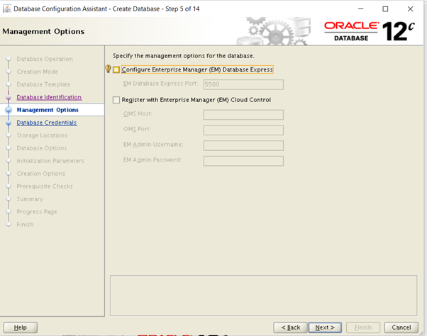 Make sure both the “Configure Enterprise Manager (EM) Database Express” and “Register with Enterprise Manager (EM) Cloud Control” options are unchecked, then click the “Next” button.