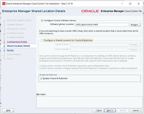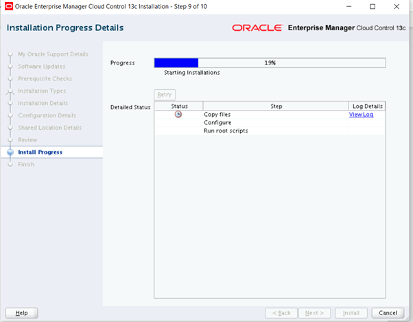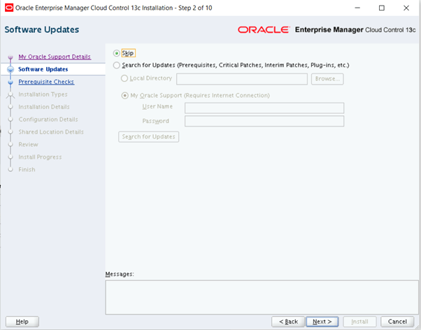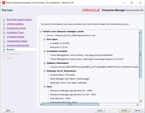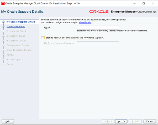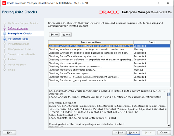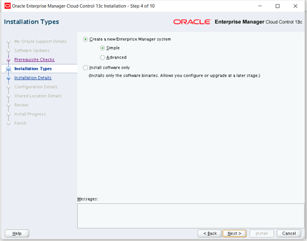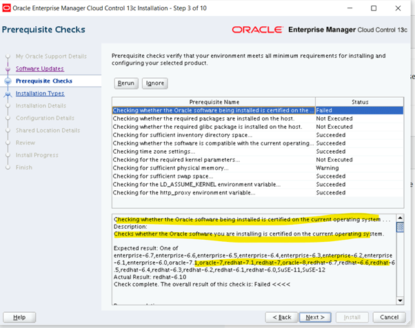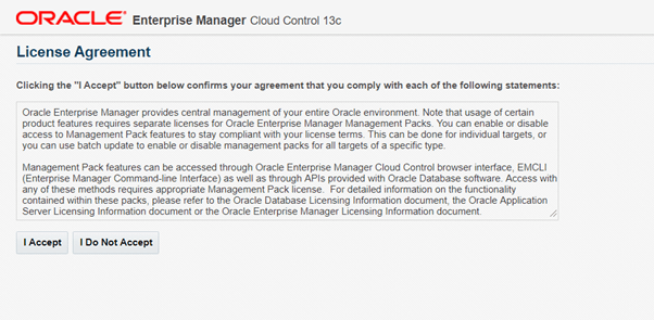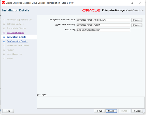 [oracle@oel6-rac01 12c_OEM]$ chmod u+x em13100_linux64.bin[oracle@oel6-rac01 12c_OEM]$ ./em13100_linux64.bin0%...............................................................100%Launcher log file is /tmp/OraInstall2020-05-06_08-01-42PM/launcher2020-05-06_08-01-42PM.log.Starting Oracle Universal InstallerChecking if CPU speed is above 300 MHz. Actual 1500.251 MHz PassedChecking monitor: must be configured to display at least 256 colors. Actual 16777216 PassedChecking swap space: must be greater than 512 MB. Actual 4031 MB PassedChecking if this platform requires a 64-bit JVM. Actual 64 Passed (64-bit not required)Checking temp space: must be greater than 300 MB. Actual 116360 MB PassedPreparing to launch the Oracle Universal Installer from /tmp/OraInstall2020-05-06_08-01-42PM====Prereq Config Location main===/tmp/OraInstall2020-05-06_08-01-42PM/stage/prereqEMGCInstaller args -scratchPathEMGCInstaller args /tmp/OraInstall2020-05-06_08-01-42PMEMGCInstaller args -sourceTypeEMGCInstaller args networkEMGCInstaller args -timestampEMGCInstaller args 2020-05-06_08-01-42PMEMGCInstaller args -paramFileEMGCInstaller args /tmp/sfx_GyKWh0/Disk1/install/linux64/oraparam.iniEMGCInstaller args -nocleanUpOnExitDiskLoc inside SourceLoc/shared_dir/12c_OEMEMFileLoc:/tmp/OraInstall2020-05-06_08-01-42PM/oui/em/ScratchPathValue :/tmp/OraInstall2020-05-06_08-01-42PM