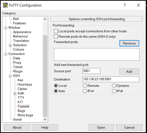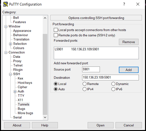 Provide the public ip of the VM instance in Tunnels and port 5901 as mentioned below and click add