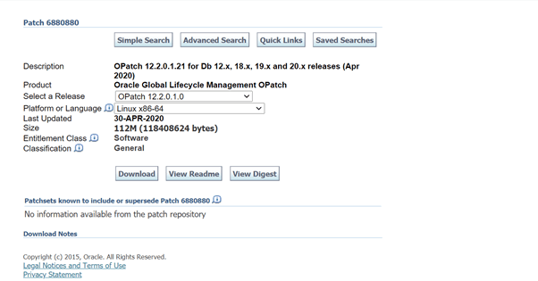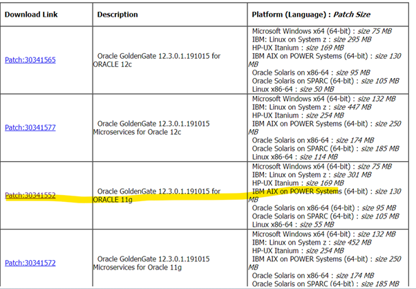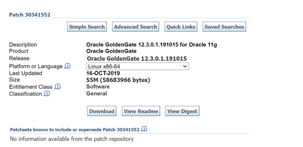 In our case we want to apply patch 12.3.0.1.191015 (30341552) on GG home. Note that our OGG version is 12.3 but database is 11.2.0.3. So select the patch carefully as per your env
