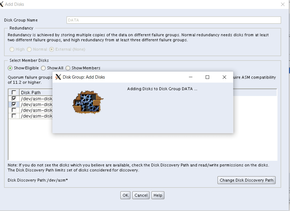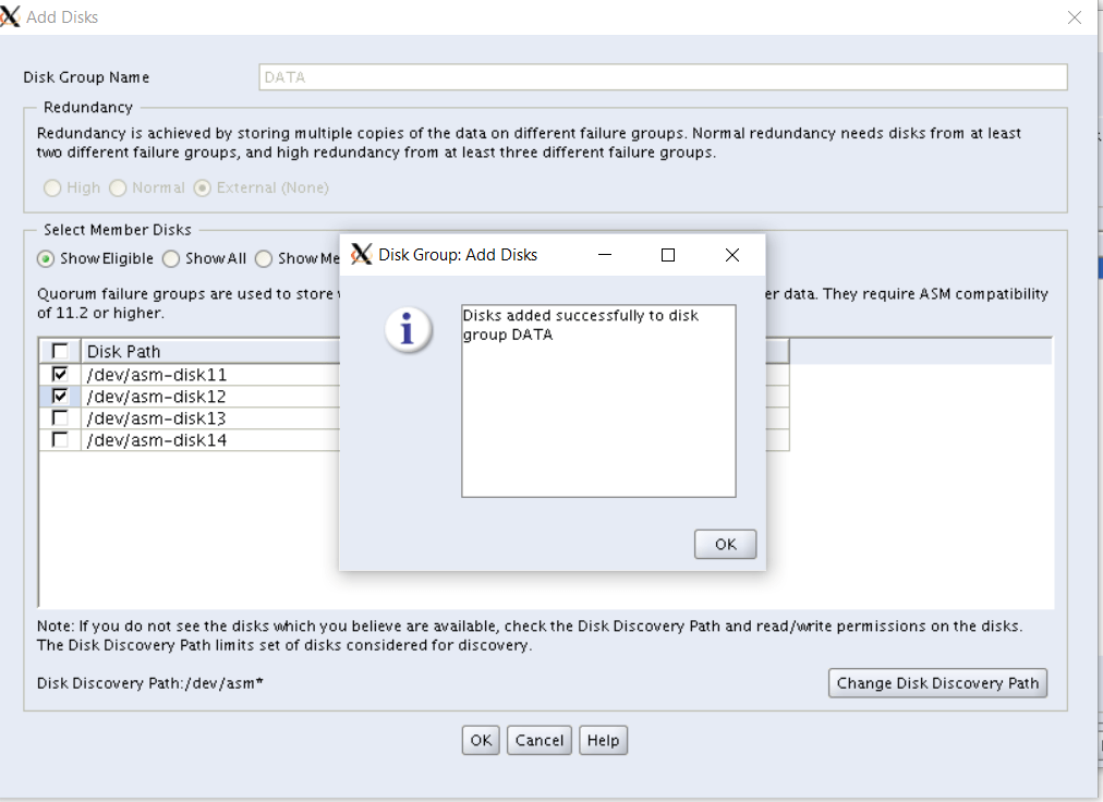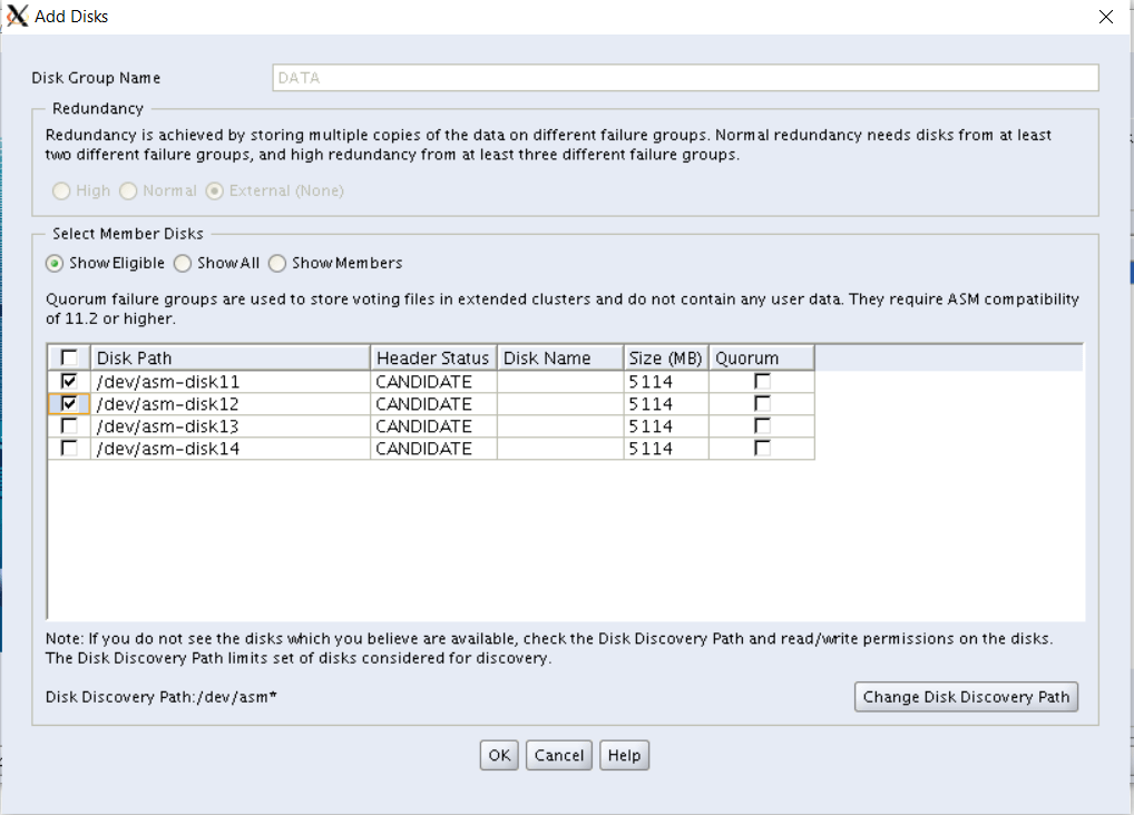 We have 4 disks available. We will add disk asm11 and asm12 using asmca. after that we will add asm13 and asm14 using manual method.