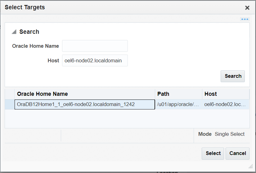 click on search icon on oracle home. you will get this window. here just put host name and search you see see the the OH and select it