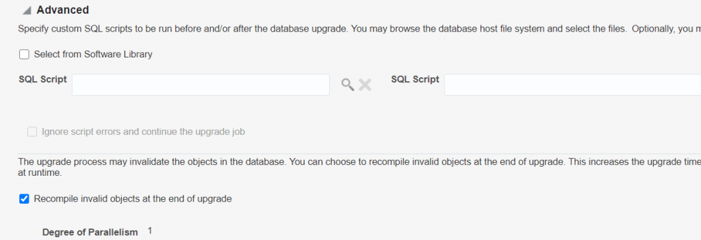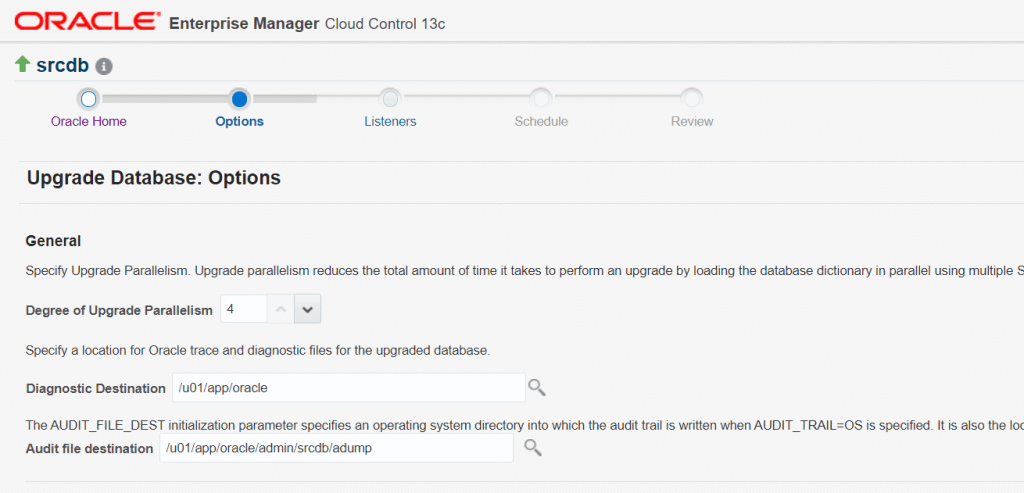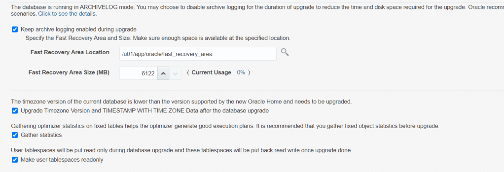 change the default values of paremeters as you wish. I selected upgrade timezone, gather stats and make tablespace readonly option maunally.