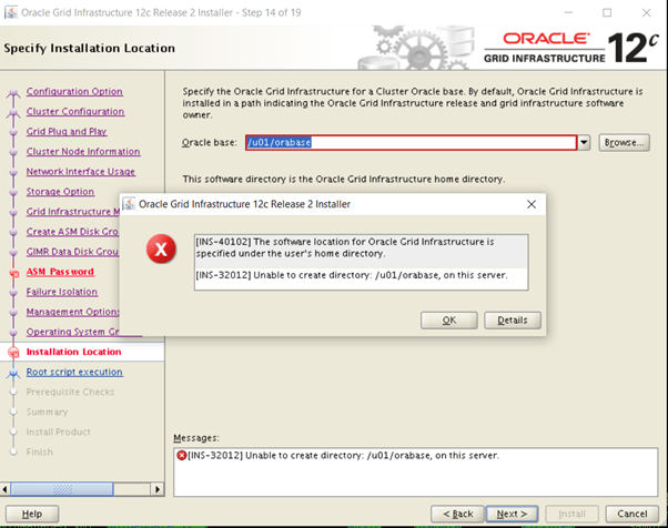 The Oracle base has been changed from /u01/app/oracle to /u01/orabase