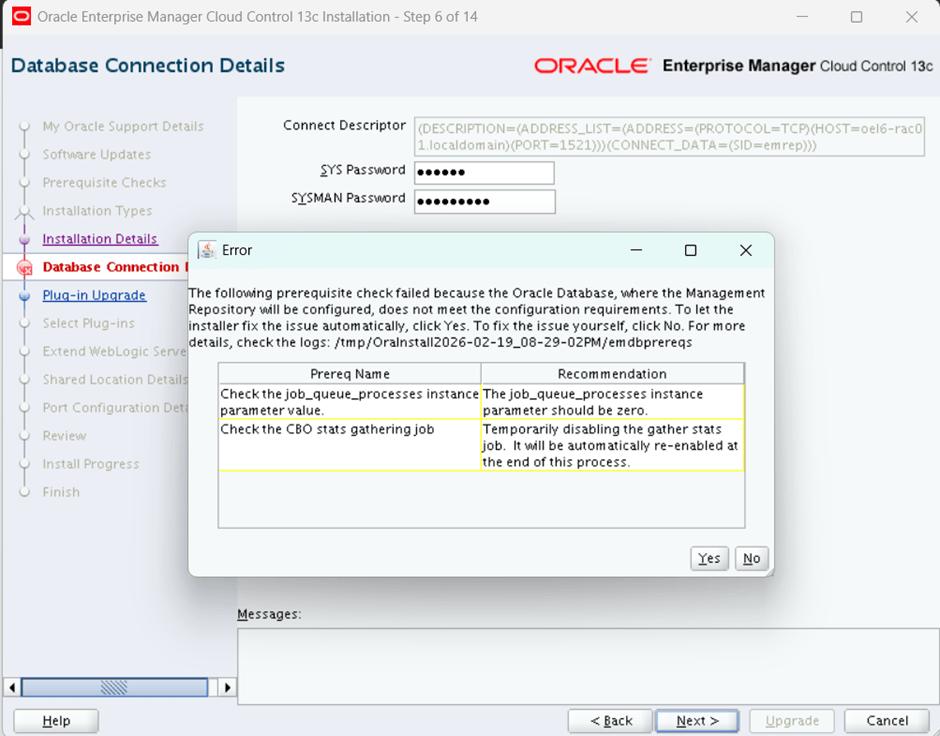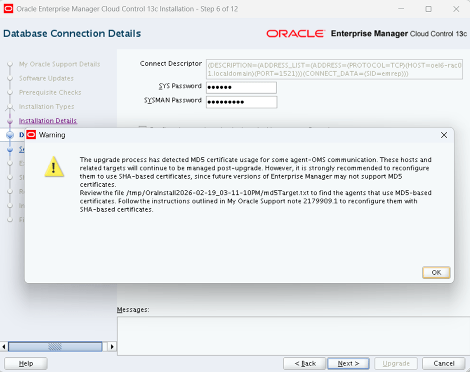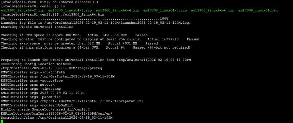 [oracle@oel6-rac01 ~]$ /u01/app/oracle/agent/agent_13.1.0.0.0/bin/emctl start agentOracle Enterprise Manager Cloud Control 13c Release 1Copyright (c) 1996, 2015 Oracle Corporation. All rights reserved.Starting agent .......................................................... started.[oracle@oel6-rac01 ~]$ /u01/app/oracle/agent/agent_13.1.0.0.0/bin/emctl status agentOracle Enterprise Manager Cloud Control 13c Release 1Copyright (c) 1996, 2015 Oracle Corporation. All rights reserved.---------------------------------------------------------------Agent Version : 13.1.0.0.0OMS Version : 13.3.0.0.0Protocol Version : 12.1.0.1.0Agent Home : /u01/app/oracle/agent/agent_instAgent Log Directory : /u01/app/oracle/agent/agent_inst/sysman/logAgent Binaries : /u01/app/oracle/agent/agent_13.1.0.0.0Core JAR Location : /u01/app/oracle/agent/agent_13.1.0.0.0/jlibAgent Process ID : 3737Parent Process ID : 3648Agent URL : https://oel6-rac01.localdomain:3872/emd/main/Local Agent URL in NAT : https://oel6-rac01.localdomain:3872/emd/main/Repository URL : https://oel6-rac01.localdomain:4904/empbs/uploadStarted at : 2026-02-20 14:26:34Started by user : oracleOperating System : Linux version 4.1.12-124.38.1.el6uek.x86_64 (amd64)Number of Targets : 46Last Reload : (none)Last successful upload : 2026-02-20 14:27:41Last attempted upload : 2026-02-20 14:27:41Total Megabytes of XML files uploaded so far : 0.11Number of XML files pending upload : 0Size of XML files pending upload(MB) : 0Available disk space on upload filesystem : 27.38%Collection Status : Collections enabledHeartbeat Status : OkLast attempted heartbeat to OMS : 2026-02-20 14:27:13Last successful heartbeat to OMS : 2026-02-20 14:27:13Next scheduled heartbeat to OMS : 2026-02-20 14:28:22---------------------------------------------------------------Agent is Running and Ready[oracle@oel6-rac01 ~]$ /u01/app/oracle/agent/agent_13.1.0.0.0/bin/emctl upload agentOracle Enterprise Manager Cloud Control 13c Release 1Copyright (c) 1996, 2015 Oracle Corporation. All rights reserved.---------------------------------------------------------------EMD upload completed successfully