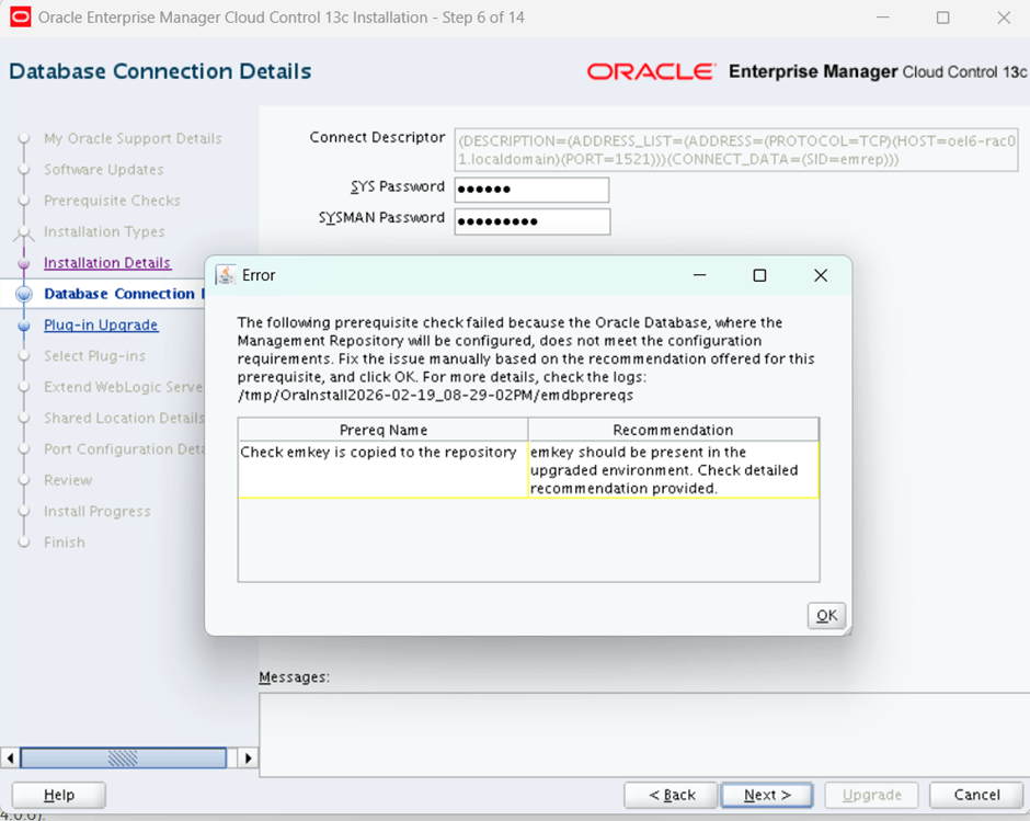 [oracle@oel6-rac01 ~]$ /u01/app/oracle/middleware/bin/emctl status emkeyOracle Enterprise Manager Cloud Control 13c Release 1Copyright (c) 1996, 2015 Oracle Corporation. All rights reserved.Enter Enterprise Manager Root (SYSMAN) Password :The EMKey is configured properly.[oracle@oel6-rac01 ~]$ /u01/app/oracle/middleware/bin/emctl config emkey -copy_to_reposOracle Enterprise Manager Cloud Control 13c Release 1Copyright (c) 1996, 2015 Oracle Corporation. All rights reserved.Enter Enterprise Manager Root (SYSMAN) Password :The EMKey has been copied to the Management Repository. This operation will cause the EMKey to become unsecure.After the required operation has been completed, secure the EMKey by running "emctl config emkey -remove_from_repos".[oracle@oel6-rac01 ~]$ /u01/app/oracle/middleware/bin/emctl status emkeyOracle Enterprise Manager Cloud Control 13c Release 1Copyright (c) 1996, 2015 Oracle Corporation. All rights reserved.Enter Enterprise Manager Root (SYSMAN) Password :The EMKey is configured properly, but is not secure. Secure the EMKey by running "emctl config emkey -remove_from_repos".[oracle@oel6-rac01 ~]$