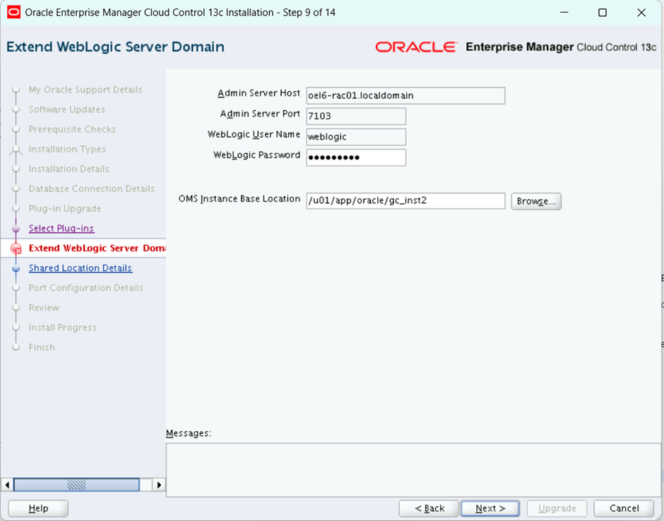 [root@oel6-rac01 middleware1]# /u01/app/oracle/middleware1/allroot.shStarting to execute allroot.sh .........Starting to execute /u01/app/oracle/middleware1/root.sh ....../etc exist/u01/app/oracle/middleware1Finished execution of /u01/app/oracle/middleware1/root.sh ......[oracle@oel6-rac01 bin]$ /u01/app/oracle/middleware1/bin/emctl status oms -detailsOracle Enterprise Manager Cloud Control 13c Release 3Copyright (c) 1996, 2018 Oracle Corporation. All rights reserved.Enter Enterprise Manager Root (SYSMAN) Password :Console Server Host : oel6-rac01.localdomainHTTP Console Port : 7790HTTPS Console Port : 7803HTTP Upload Port : 4890HTTPS Upload Port : 4904EM Instance Home : /u01/app/oracle/gc_inst2/em/EMGC_OMS1OMS Log Directory Location : /u01/app/oracle/gc_inst2/em/EMGC_OMS1/sysman/logOMS is not configured with SLB or virtual hostnameAgent Upload is locked.OMS Console is locked.Active CA ID: 1Console URL: https://oel6-rac01.localdomain:7803/emUpload URL: https://oel6-rac01.localdomain:4904/empbs/uploadWLS Domain InformationDomain Name : GCDomainAdmin Server Host : oel6-rac01.localdomainAdmin Server HTTPS Port: 7103Admin Server is RUNNINGOracle Management Server InformationManaged Server Instance Name: EMGC_OMS1Oracle Management Server Instance Host: oel6-rac01.localdomainWebTier is UpOracle Management Server is UpJVMD Engine is UpBI Publisher Server InformationBI Publisher Managed Server Name: BIPBI Publisher Server is UpBI Publisher HTTP Managed Server Port : 9701BI Publisher HTTPS Managed Server Port : 9804BI Publisher HTTP OHS Port : 9788BI Publisher HTTPS OHS Port : 9851BI Publisher is locked.BI Publisher Server named 'BIP' running at URL: https://oel6-rac01.localdomain:9851/xmlpserver/servlet/homeBI Publisher Server Logs: /u01/app/oracle/gc_inst2/user_projects/domains/GCDomain/servers/BIP/logs/BI Publisher Log : /u01/app/oracle/gc_inst2/user_projects/domains/GCDomain/servers/BIP/logs/bipublisher/bipublisher.log