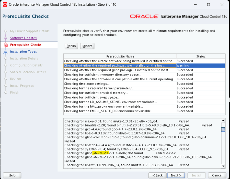 [root@oel6-rac01 ~]# rpm -qa|grep glibcglibc-2.12-1.212.0.3.el6_10.3.x86_64glibc-headers-2.12-1.212.0.3.el6_10.3.x86_64glibc-devel-2.12-1.212.0.3.el6_10.3.x86_64glibc-common-2.12-1.212.0.3.el6_10.3.x86_64[root@oel6-rac01 ~]# yum install -y glibc.i686 glibc-devel.i686 glibc-static.i686Loaded plugins: refresh-packagekit, security, ulninfoSetting up Install ProcessResolving Dependencies--> Running transaction check---> Package glibc.i686 0:2.12-1.212.0.3.el6_10.3 will be installed--> Processing Dependency: libfreebl3.so(NSSRAWHASH_3.12.3) for package: glibc-2.12-1.212.0.3.el6_10.3.i686--> Processing Dependency: libfreebl3.so for package: glibc-2.12-1.212.0.3.el6_10.3.i686---> Package glibc-devel.i686 0:2.12-1.212.0.3.el6_10.3 will be installed---> Package glibc-static.i686 0:2.12-1.212.0.3.el6_10.3 will be installed--> Running transaction check---> Package nss-softokn-freebl.x86_64 0:3.44.0-6.0.1.el6_10 will be updated---> Package nss-softokn-freebl.i686 0:3.44.0-6.0.2.el6_10 will be installed---> Package nss-softokn-freebl.x86_64 0:3.44.0-6.0.2.el6_10 will be an update--> Finished Dependency ResolutionDependencies Resolved============================================================================================================================================================================================= Package Arch Version Repository Size=============================================================================================================================================================================================Installing: glibc i686 2.12-1.212.0.3.el6_10.3 ol6_latest 4.4 M glibc-devel i686 2.12-1.212.0.3.el6_10.3 ol6_latest 992 k glibc-static i686 2.12-1.212.0.3.el6_10.3 ol6_latest 1.1 MInstalling for dependencies: nss-softokn-freebl i686 3.44.0-6.0.2.el6_10 ol6_latest 201 kUpdating for dependencies: nss-softokn-freebl x86_64 3.44.0-6.0.2.el6_10 ol6_latest 202 kTransaction Summary=============================================================================================================================================================================================Install 4 Package(s)Upgrade 1 Package(s)Total download size: 6.9 MDownloading Packages:(1/5): glibc-2.12-1.212.0.3.el6_10.3.i686.rpm | 4.4 MB 00:00(2/5): glibc-devel-2.12-1.212.0.3.el6_10.3.i686.rpm | 992 kB 00:01(3/5): glibc-static-2.12-1.212.0.3.el6_10.3.i686.rpm | 1.1 MB 00:01(4/5): nss-softokn-freebl-3.44.0-6.0.2.el6_10.i686.rpm | 201 kB 00:00(5/5): nss-softokn-freebl-3.44.0-6.0.2.el6_10.x86_64.rpm | 202 kB 00:00---------------------------------------------------------------------------------------------------------------------------------------------------------------------------------------------Total 581 kB/s | 6.9 MB 00:12Running rpm_check_debugRunning Transaction TestTransaction Test SucceededRunning TransactionWarning: RPMDB altered outside of yum. Installing : glibc-2.12-1.212.0.3.el6_10.3.i686 1/6 Installing : nss-softokn-freebl-3.44.0-6.0.2.el6_10.i686 2/6 Installing : glibc-devel-2.12-1.212.0.3.el6_10.3.i686 3/6 Installing : glibc-static-2.12-1.212.0.3.el6_10.3.i686 4/6 Updating : nss-softokn-freebl-3.44.0-6.0.2.el6_10.x86_64 5/6 Cleanup : nss-softokn-freebl-3.44.0-6.0.1.el6_10.x86_64 6/6 Verifying : glibc-static-2.12-1.212.0.3.el6_10.3.i686 1/6 Verifying : nss-softokn-freebl-3.44.0-6.0.2.el6_10.i686 2/6 Verifying : glibc-devel-2.12-1.212.0.3.el6_10.3.i686 3/6 Verifying : nss-softokn-freebl-3.44.0-6.0.2.el6_10.x86_64 4/6 Verifying : glibc-2.12-1.212.0.3.el6_10.3.i686 5/6 Verifying : nss-softokn-freebl-3.44.0-6.0.1.el6_10.x86_64 6/6Installed: glibc.i686 0:2.12-1.212.0.3.el6_10.3 glibc-devel.i686 0:2.12-1.212.0.3.el6_10.3 glibc-static.i686 0:2.12-1.212.0.3.el6_10.3Dependency Installed: nss-softokn-freebl.i686 0:3.44.0-6.0.2.el6_10Dependency Updated: nss-softokn-freebl.x86_64 0:3.44.0-6.0.2.el6_10Complete![root@oel6-rac01 ~]#[root@oel6-rac01 ~]# rpm -qa|grep glibcglibc-devel-2.12-1.212.0.3.el6_10.3.i686glibc-2.12-1.212.0.3.el6_10.3.i686glibc-2.12-1.212.0.3.el6_10.3.x86_64glibc-headers-2.12-1.212.0.3.el6_10.3.x86_64glibc-devel-2.12-1.212.0.3.el6_10.3.x86_64glibc-static-2.12-1.212.0.3.el6_10.3.i686glibc-common-2.12-1.212.0.3.el6_10.3.x86_64[root@oel6-rac01 ~]#