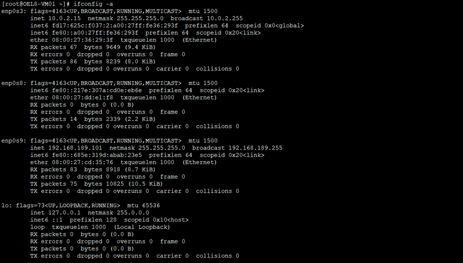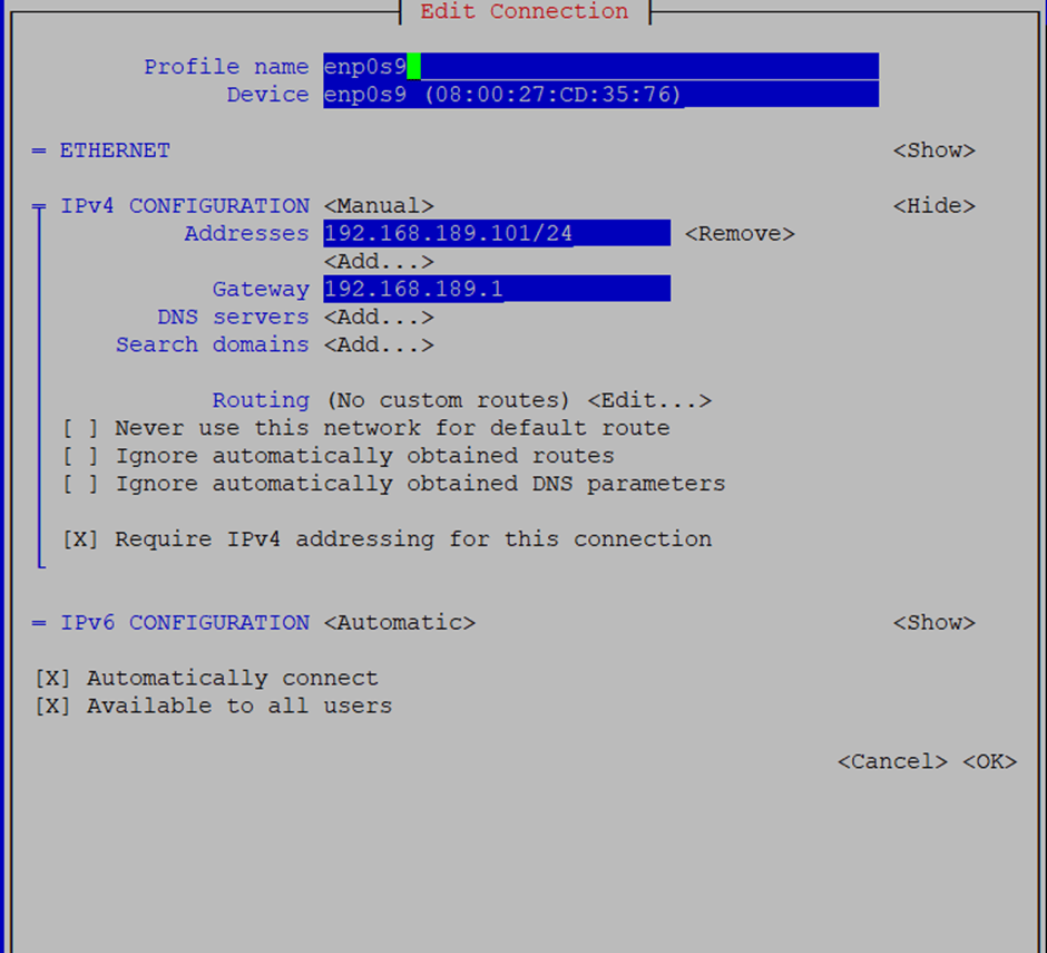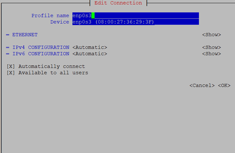Once the OEL8 is installed, make the following changes. Use the nmtui utility in network adapters to enable internet access and a putty session.