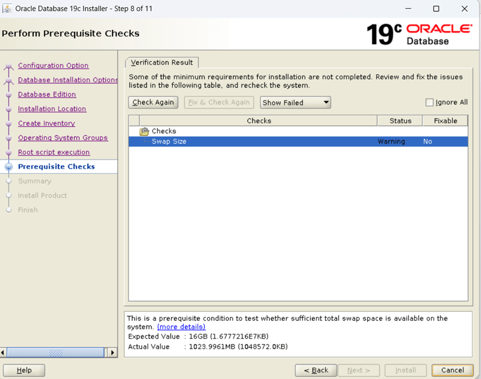 [root@OEL8-VM01 /]# free -g total used free shared buff/cache availableMem: 19 0 5 0 13 18Swap: 0 0 0[root@OEL8-VM01 /]# swapon -sFilename Type Size Used Priority/dev/sda2 partition 1048572 0 -2[root@OEL8-VM01 /]# sudo swapoff -a[root@OEL8-VM01 /]# sudo rm -f /swapfile[root@OEL8-VM01 /]# sudo fallocate -l 16G /swapfile[root@OEL8-VM01 /]# sudo chmod 600 /swapfile[root@OEL8-VM01 /]# sudo mkswap /swapfileSetting up swapspace version 1, size = 16 GiB (17179865088 bytes)no label, UUID=e1852e29-007c-47de-8954-cdba5d631d41[root@OEL8-VM01 /]# sudo swapon /swapfile[root@OEL8-VM01 /]# sudo vi /etc/fstab#Add below line at end and save the file/swapfile swap swap defaults 0 0[root@OEL8-VM01 /]# free -g total used free shared buff/cache availableMem: 19 0 5 0 13 18Swap: 15 0 15press check again