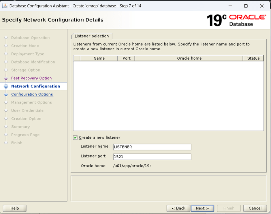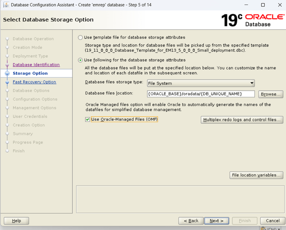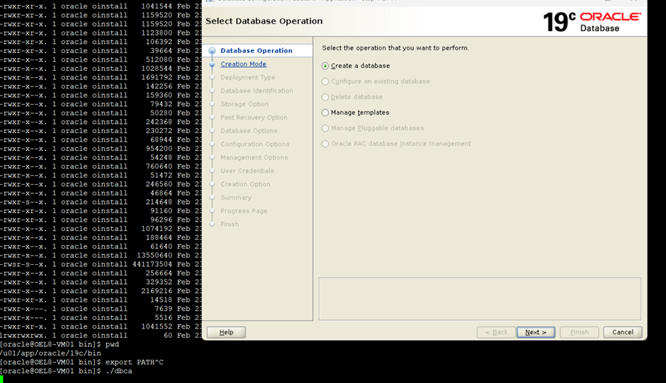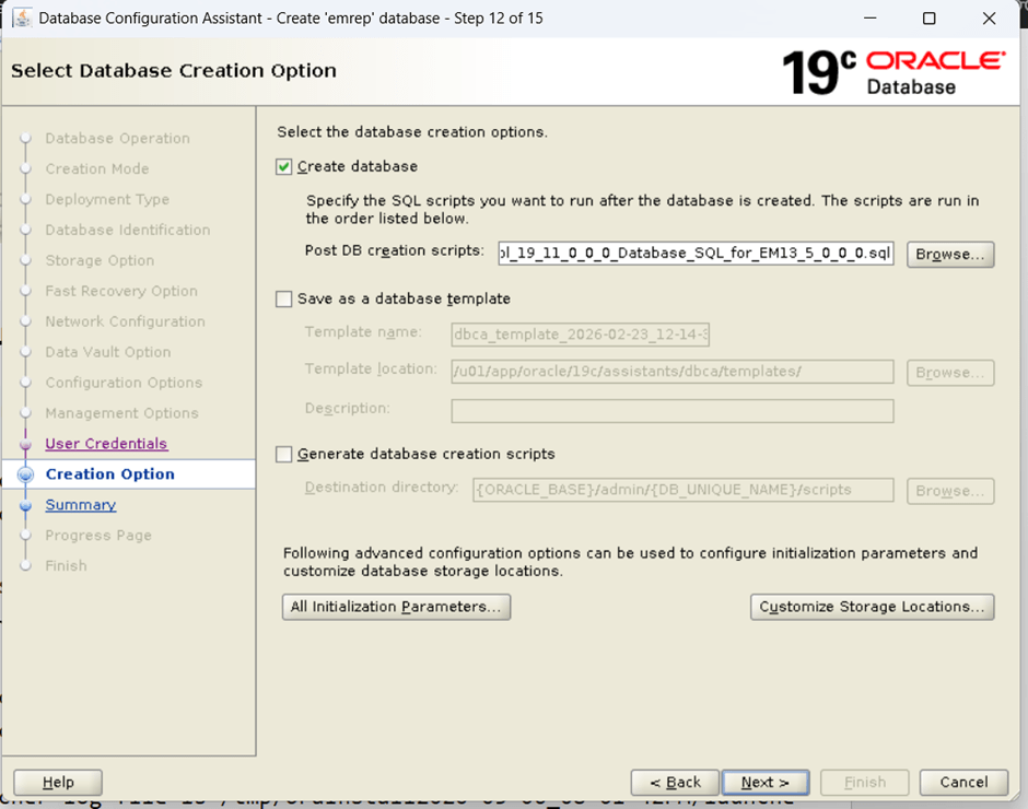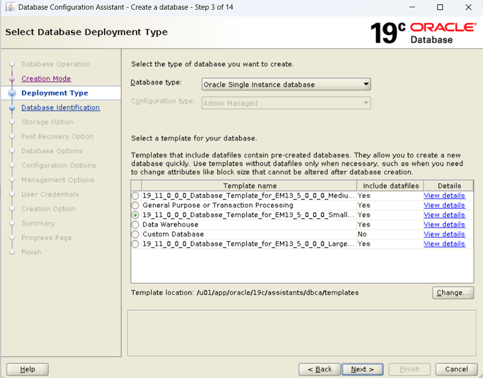 [oracle@OEL8-VM01 19c_db_sw]$ cd /u01/app/oracle/19c/assistants/dbca/templates/[oracle@OEL8-VM01 templates]$ pwd/u01/app/oracle/19c/assistants/dbca/templates[oracle@OEL8-VM01 templates]$ cp /shared_dir/12c_OEM/19c_template/19_11_0_0_0_Database_Template_for_EM13_5_0_0_0_Linux_x64.zip .[oracle@OEL8-VM01 templates]$[oracle@OEL8-VM01 templates]$ unzip 19_11_0_0_0_Database_Template_for_EM13_5_0_0_0_Linux_x64.zipArchive: 19_11_0_0_0_Database_Template_for_EM13_5_0_0_0_Linux_x64.zip inflating: set_repo_param_19_11_0_0_0_Database_SQL_for_EM13_5_0_0_0_Large_deployment.sql inflating: set_repo_param_19_11_0_0_0_Database_SQL_for_EM13_5_0_0_0_Medium_deployment.sql inflating: set_repo_param_19_11_0_0_0_Database_SQL_for_EM13_5_0_0_0_Small_deployment.sql inflating: shpool_19_11_0_0_0_Database_SQL_for_EM13_5_0_0_0.sql inflating: 19_11_0_0_0_Database_Template_for_EM13_5_0_0_0_Large_deployment.dbc inflating: 19_11_0_0_0_Database_Template_for_EM13_5_0_0_0_Medium_deployment.dbc inflating: 19_11_0_0_0_Database_Template_for_EM13_5_0_0_0_Small_deployment.dbc inflating: 19_11_0_0_0_Database_Template_for_EM13_5_0_0_0.dfb inflating: 19_11_0_0_0_Database_Template_for_EM13_5_0_0_0.ctl[oracle@OEL8-VM01 templates]$